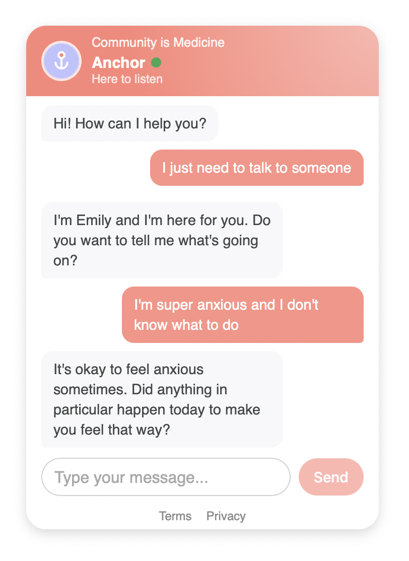 Anchor operates through a secure web-based chat. We do not use SMS, social media, or third-party messaging platforms that may compromise privacy or data security.